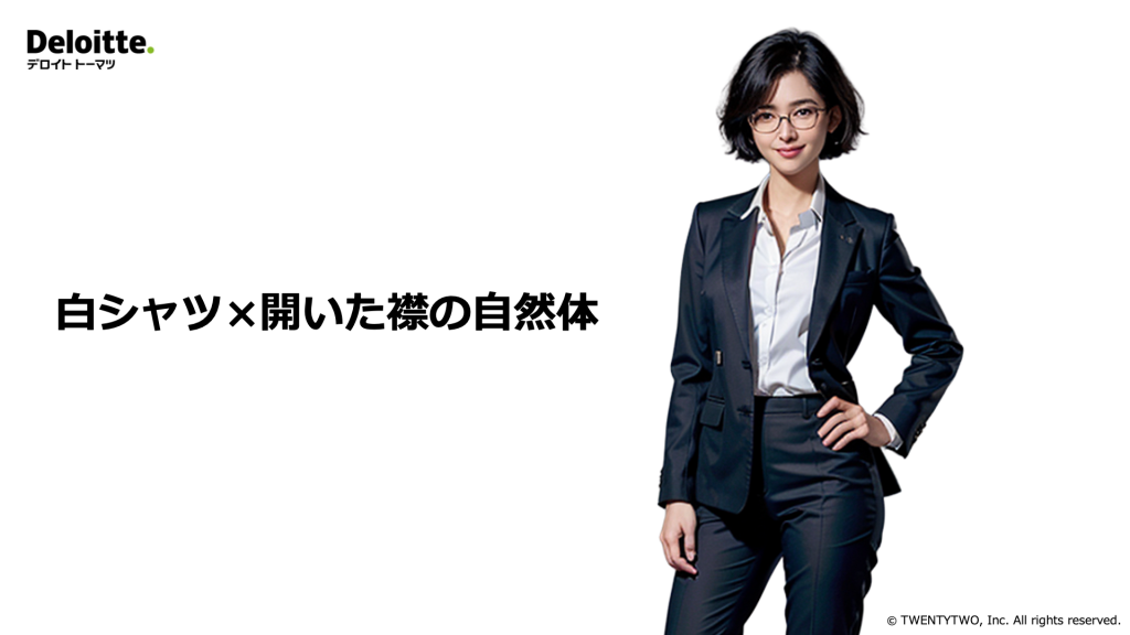 第一ボタンを外した白シャツは、形式ばらずに本質を重んじるスタイルを表現しています。ロジックと人間らしさの両方を大事にするデロイトらしい選択です。