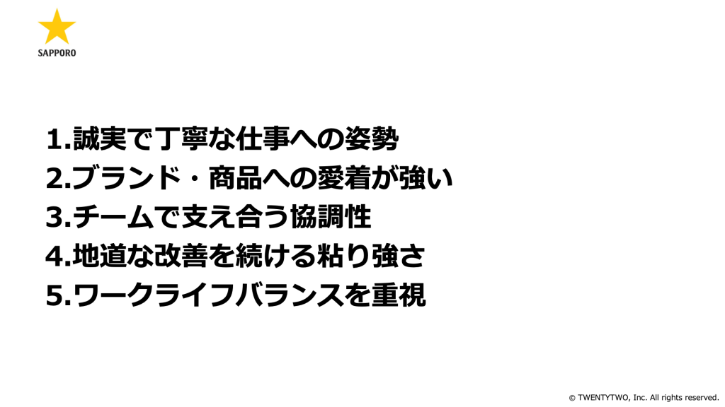 現場主義でフットワークの軽いサッポロ社員らしく、動きやすさと実用性を重視しています。マーケティングや営業など、多様な職種が一体となる姿勢が表れています。