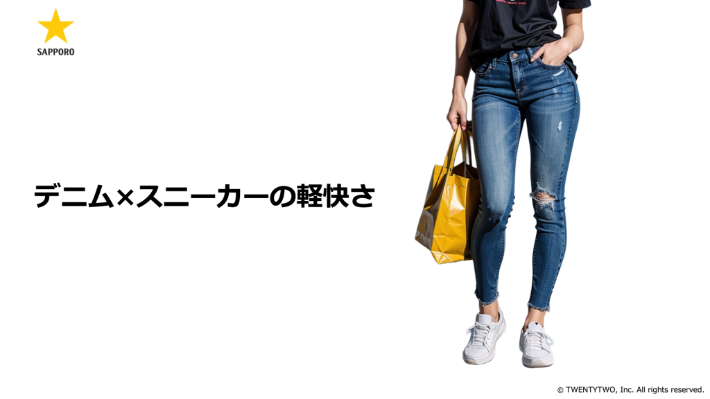 黄色いトートバッグが、落ち着いた印象の中にも明るさと遊び心をプラスしています。堅実さの中に“楽しさ”を見出すサッポロのバランス感覚を象徴しています。