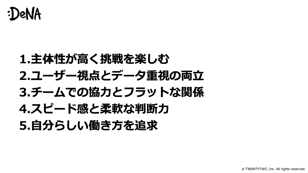 DeNAの女性社員は、年齢や役職に関係なく意見を出しやすい環境で、自ら手を挙げてプロジェクトに挑戦する姿勢が強いです。未知の領域にも積極的に取り組み、新しい価値を生み出すことにやりがいを感じています。