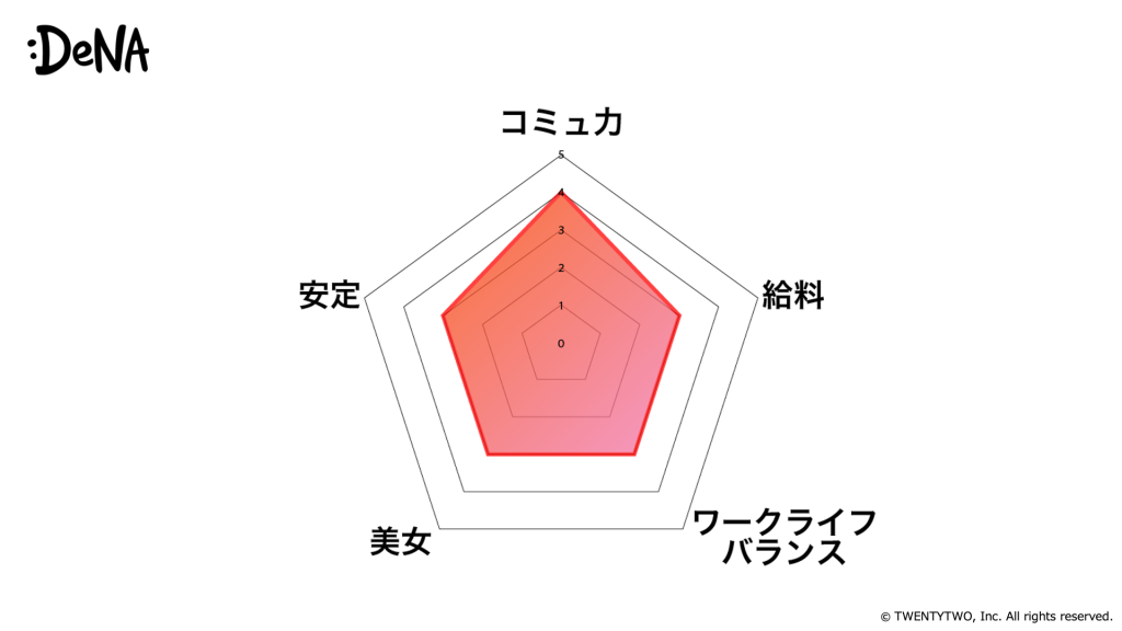 DeNAはフラットな組織文化とスピード感のある意思決定が特徴で、チーム内やプロジェクト間での活発な議論が求められます。若手でも意見を発信しやすく、柔軟でオープンなコミュニケーションを好む社員が多いため、コミュ力は高めの4点としました。