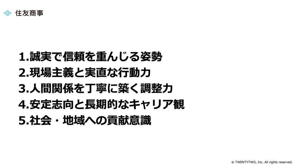 住友グループの理念として「社会とともに発展する」が根付いており、女性社員も環境・地域・社会に配慮した事業づくりに共感しています。利益だけではなく、社会との調和を意識する姿勢が特徴です。