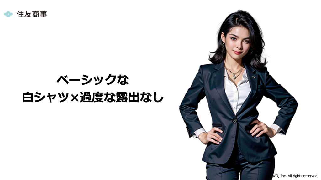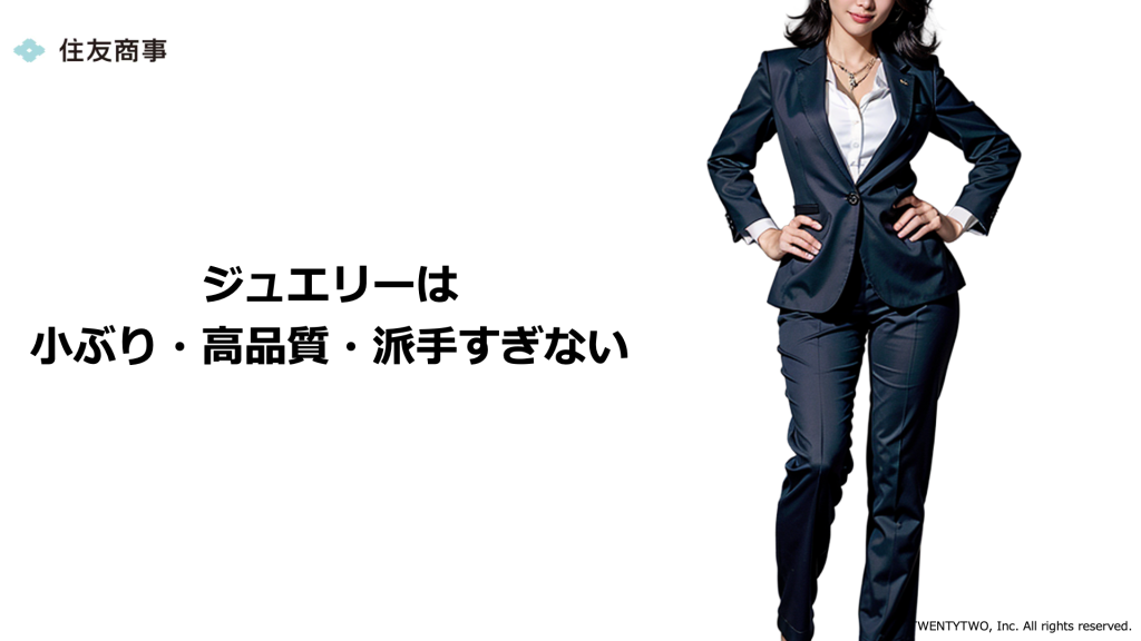 ネックレスや腕時計はシンプルで上質。「目立つよりも信頼されること」を大切にする社風が反映されており、老舗商社らしい堅実さが漂います。