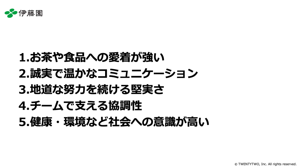 お茶の栽培・製造・販売など長期的な視点で事業を行う企業であり、女性社員もすぐに結果を求めるのではなく、地道にコツコツと取り組む姿勢が根付いています。継続力と堅実な姿勢が大きな強みです。