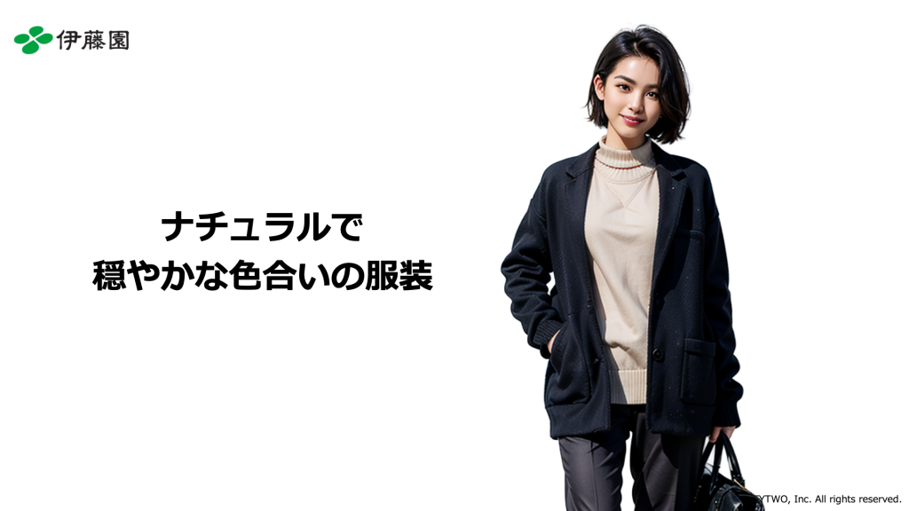 ベージュやブラウン、アイボリーなど自然を感じさせる柔らかな色味の服装が多いです。お茶文化を大切にする企業らしく、落ち着きや調和を意識したスタイルが目立ちます。