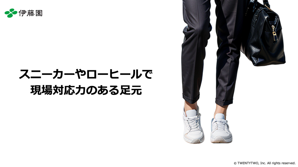 外回りや製造現場への訪問など、社外との接点が多いことから、ヒールよりもスニーカーやフラットシューズを選ぶ人が多いです。きちんと感より“誠実で動ける姿勢”を大切にしています。