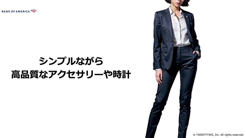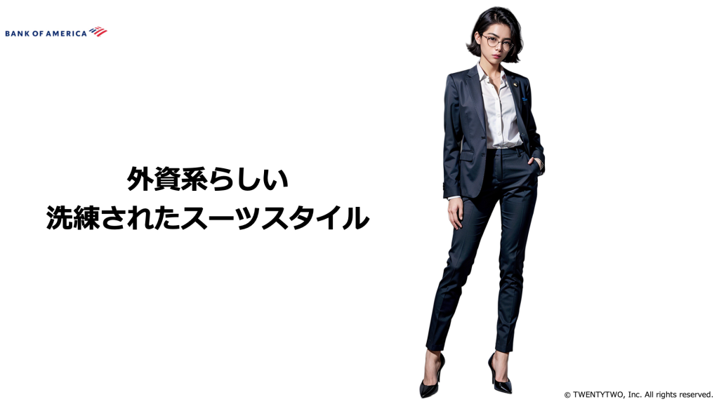 グローバル金融の最前線で成果を求められる社風のため、装いも隙のないシャープなスタイルが多いです。濃紺やブラックのテーラードスーツに、白シャツを合わせた“完璧に整ったプロフェッショナル感”が特徴です。
