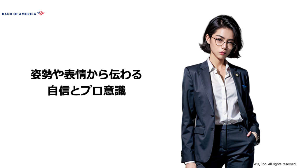 成果主義・評価主義の環境で働くため、立ち姿・目線・腕の組み方など、姿勢にも芯の強さが表れています。柔らかく笑うというよりは、落ち着いた眼差しと引き締まった表情で、“金融のプロ”という雰囲気を漂わせています。