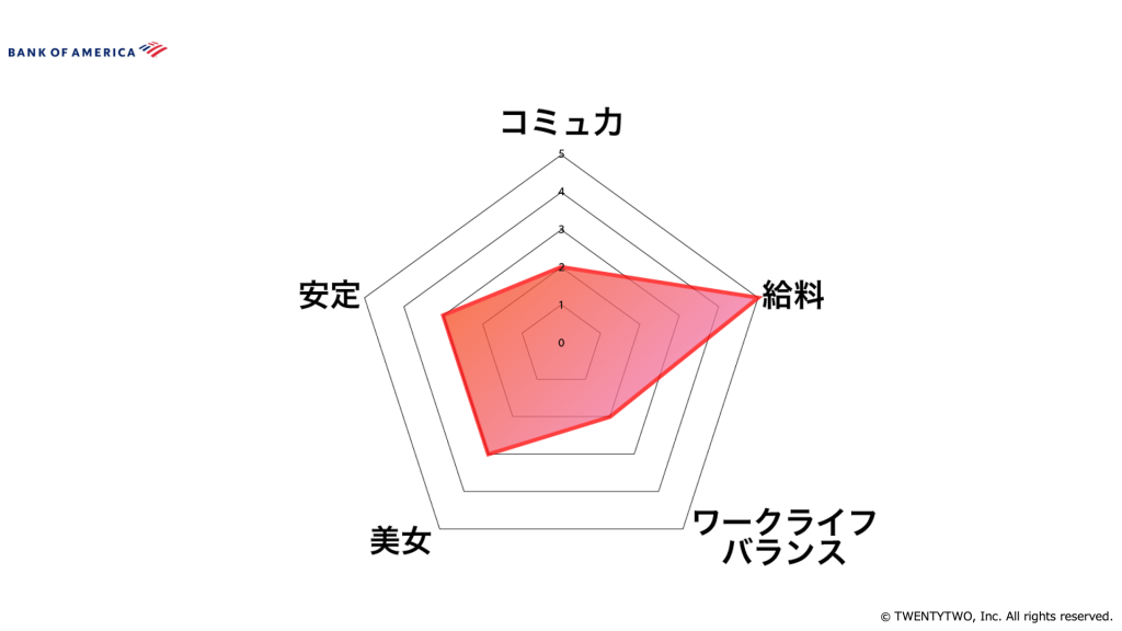 世界的金融機関である一方、金融市場の変動や業績による組織再編の影響を受けやすい業界です。企業基盤は強いものの、個人単位での雇用安定性は日本企業より低めのため、安定は3点としました。