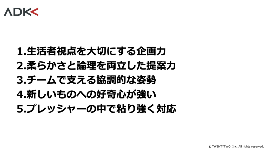 ADKは「生活者発想」を重視する広告会社であり、女性社員も生活者のリアルな感情や行動からアイデアを生み出します。データよりも人の気持ちや体験を重視し、共感を軸にした企画づくりが得意です。
