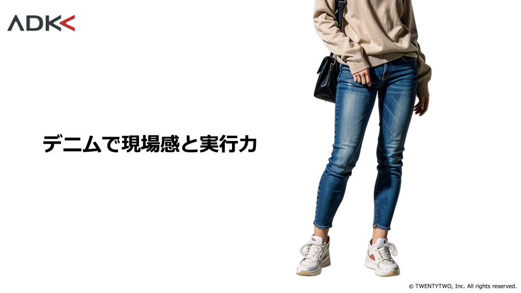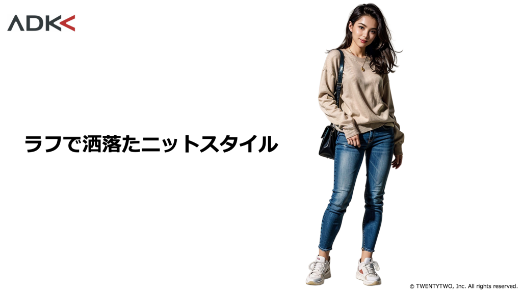 ゆるめのベージュニットは、堅苦しさよりも“アイデアが出しやすい空気”を優先するADKの自由な社風を反映しています。