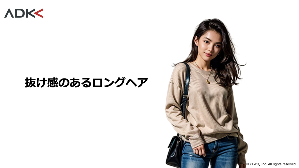 巻きすぎず自然体のロングヘアは、広告業界らしい“作り込みすぎないおしゃれ感”と、肩の力が抜けた雰囲気を表しています。