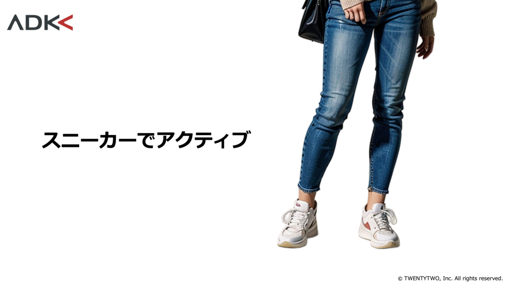 白スニーカーは、制作現場や外出にも対応しやすい選択です。会議室とロケ現場を行き来する、柔軟で現場主義な働き方を示しています。