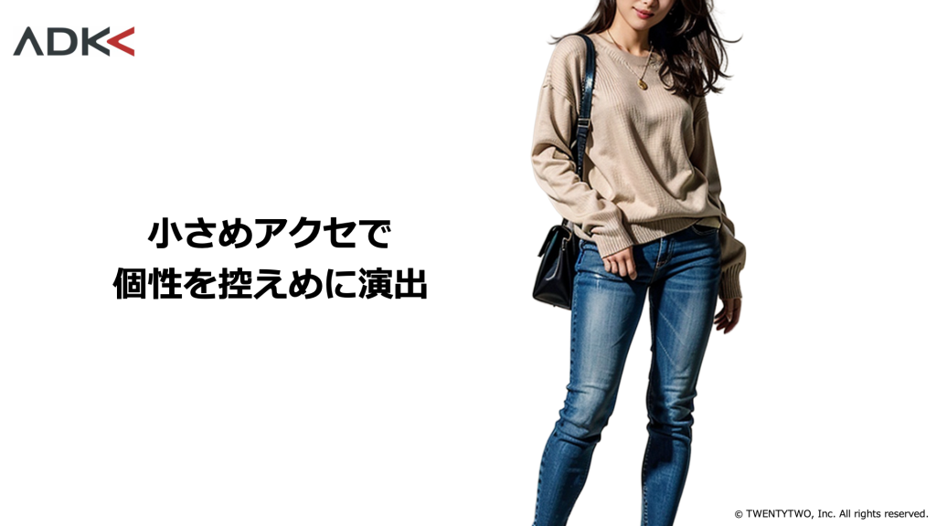 小ぶりなネックレスやシンプルなバッグで、さりげなく自分らしさを添えています。派手すぎないけれど、センスは欠かさないのがADKらしさです。